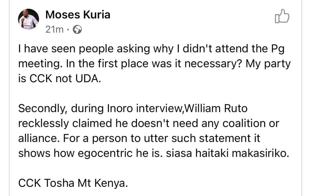 Jun 28, 2021 · gatundu south mp moses kuria has decried an order warranting the unceremonious knocking down of a billboard sponsored by the united democratic alliance (uda) party. Jun 16, 2021 · gatundu south mp moses kuria alleged that president uhuru kenyatta left his duties as the head of state and jubilee party leader in order to become an activist for the national super alliance (nasa) regime. Jun 15, 2021 · moses kuria says uhuru's a nasa campaigner, should step down for ruto kuria said uhuru has the right to back whoever he wants for the presidency in 2022 as an individual. Western kenya is raila's stronghold and hemust visit the region when uhuru visits!odm in western vow Newsnight | coalitions of convenience?